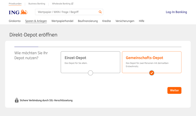 Die Eröffnung eines Gemeinschaftsdepots läuft bei den meisten Anbietern ähnlich ab. Ihr startet ganz normal mit der Depoteröffnung und entscheidet erst im Laufe des Antrags, ob es sich um ein Einzel- oder Gemeinschaftsdepot handeln soll.