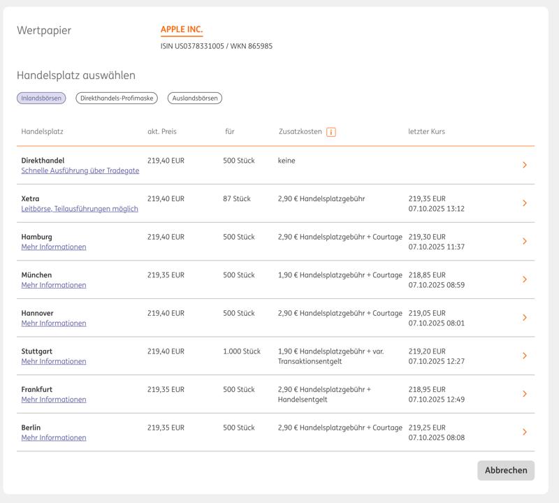 Bei der ING hat man mehrere Handelsplätze zur Auswahl – die Gebühr wird jeweils ausgewiesen.