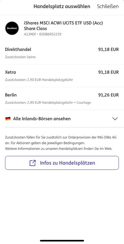 Den Handelsplatz könnt ihr bei der ING frei wählen: Ihr habt Zugang zu allen wichtigen deutschen Börsen, mehreren außerbörslichen Partnern und internationalen Märkten wie den USA. Hier können Neobroker wie Trade Republic einfach nicht mithalten.