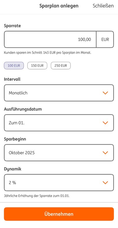 Als klassische Direktbank bietet die ING ein breites Sparplan-Angebot. Ihr könnt rund 1.100 ETFs, 570 Aktien und auch klassische Fonds regelmäßig besparen – bereits ab 1 € Mindestrate.