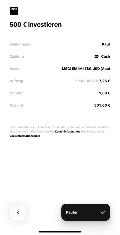 TR verzichtet nicht nur auf Depot-, ETF- und Aktien-Sparplangebühren, sondern macht auch den direkten Handel beinahe kostenlos. Pro Kauf fällt lediglich eine Fremdkostenpauschale von einem Euro an. Diese Pauschale gilt unabhängig vom Orderwert, egal, ob ihr 50 €, 500 € oder 5.000 € investiert.