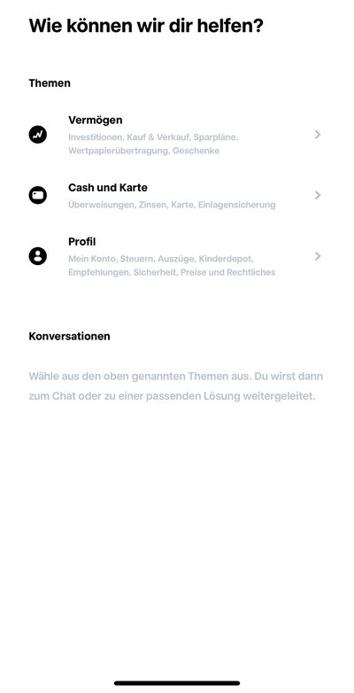 Trade Republic verzichtet vollständig auf telefonischen Support. Anfragen laufen über das Hilfe-Center, den In-App-Chat oder per E-Mail. Viele Anliegen werden automatisiert beantwortet, komplexere Fälle an das Support-Team weitergeleitet.