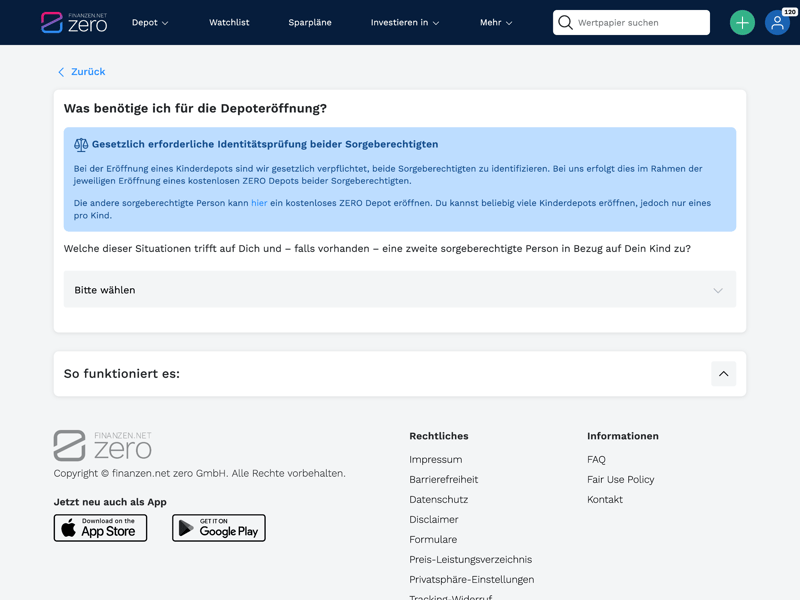 Die Eröffnung läuft komplett digital und papierlos ab. Ein wichtiger Punkt: Für die Depoteröffnung müssen alle sorgeberechtigten Elternteile ein eigenes ZERO-Depot besitzen, da beide ihre Zustimmung geben müssen. Dann könnt ihr das Kinderdepot online beantragen.