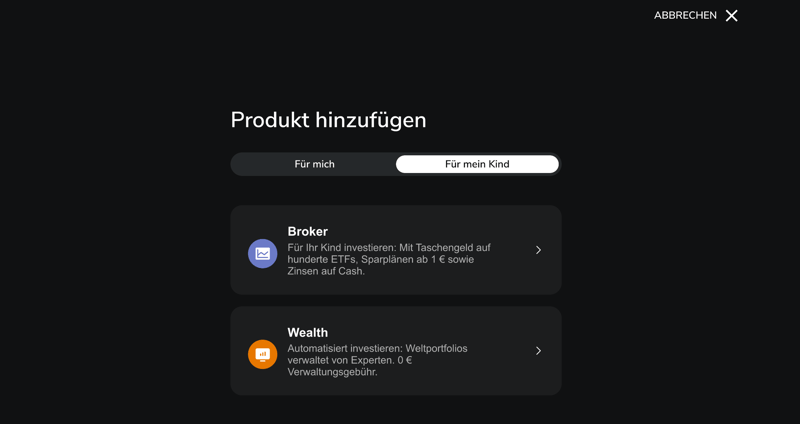 Ihr braucht zuerst ein Scalable Capital-Konto für alle Sorgeberechtigten. Erst dann könnt ihr in der App ein Kinderdepot anlegen.