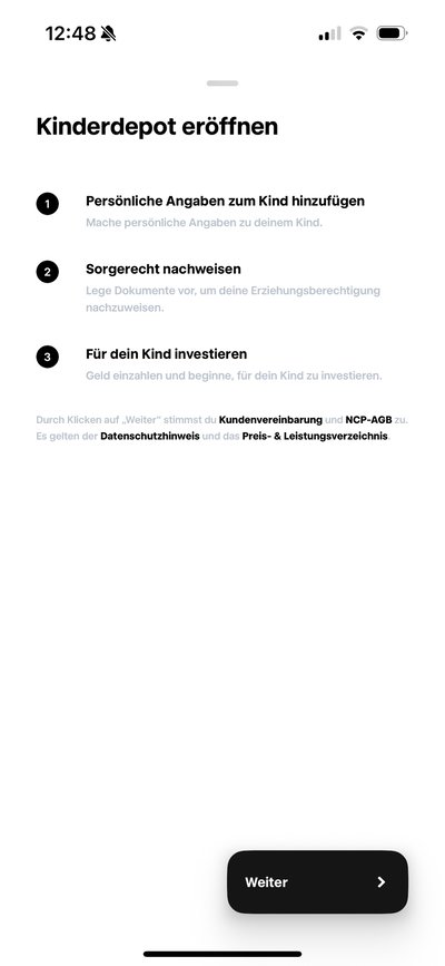 Dann geht ihr in der App bei eurem Konto auf das „+ Kinderdepot“ und gebt die Daten eures Kindes ein. Im Antragsprozess müsst ihr eine Geburtsurkunde oder ein anderes Identifikationsdokument eures Kindes hochladen.