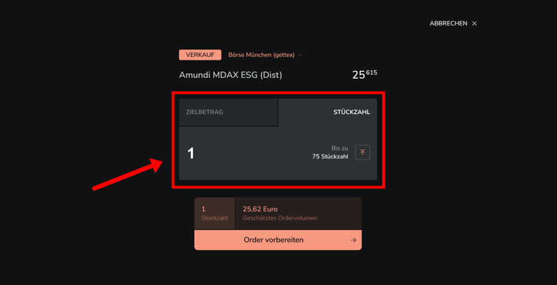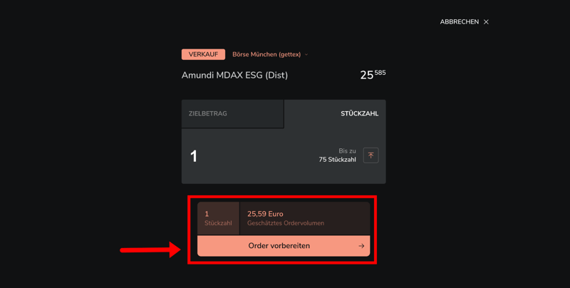 Schritt 4: Nachdem ihr Stückzahl oder Zielbetrag festgelegt und den Handelsplatz ausgewählt habt, klickt ihr auf „Order vorbereiten“.