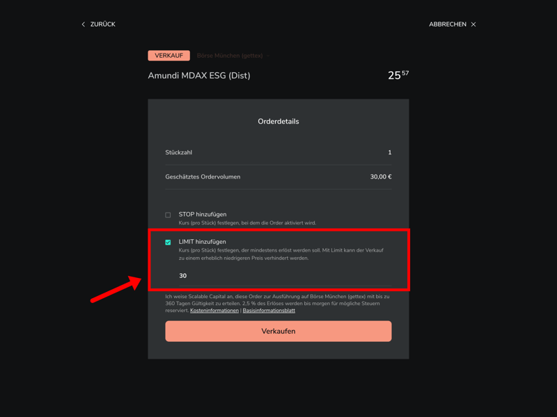 Legt nun den Limitpreis fest, zu dem euer Verkauf ausgeführt werden soll.