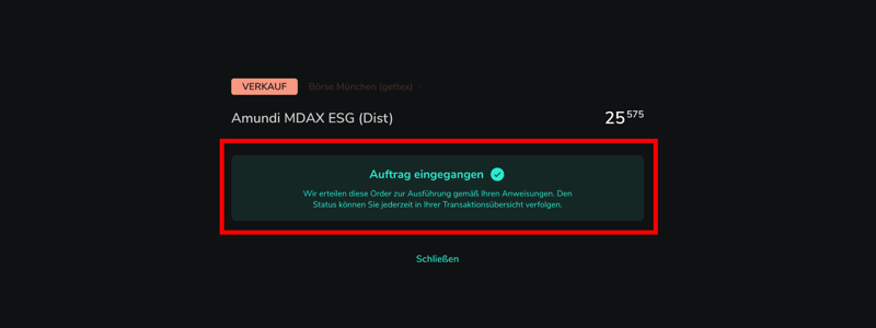 Schritt 6: Nach dem Absenden erhaltet ihr eine Bestätigung, dass euer Auftrag eingegangen ist und zur Ausführung gemäß eurer Anweisung weitergeleitet wurde.