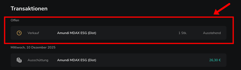 Unter „Transaktionen“ seht ihr, dass eure Order derzeit als ausstehend gekennzeichnet ist.