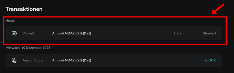 Die Stornierung wird anschließend auf der Übersichtsseite der jeweiligen Aktie oder des ETFs angezeigt. In der Transaktionsliste erscheint hinter der Order nun der Hinweis „Storniert“.