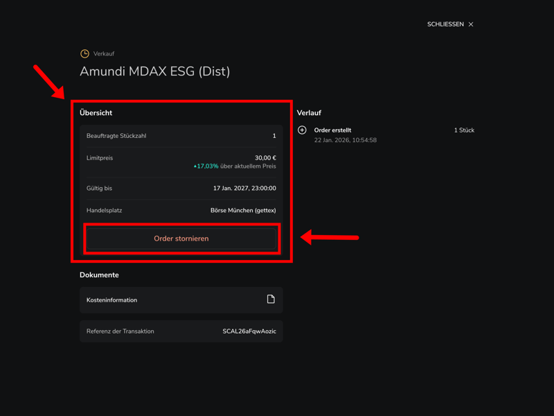 In der Detailansicht der Order seht ihr alle Informationen und könnt die Order bei Bedarf stornieren.