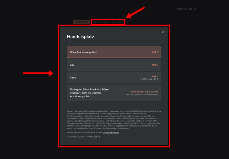 Die folgende Schritt-für-Schritt-Anleitung orientiert sich am Broker Scalable Capital* und zeigt, an welchen Stellen ihr ein Verkaufs-Limit und den Handelsplatz festlegt und wie ihr eure Order bei Bedarf wieder stornieren könnt.