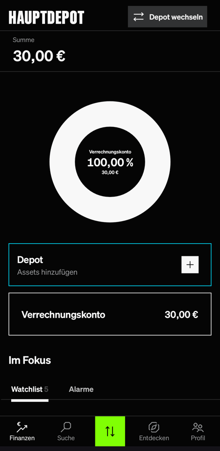 Finanzen: Hier verschafft ihr euch eine schnelle Übersicht über die Gelder in eurem Depot und die Entwicklung eurer Assets. Über den „Assets hinzufügen“-Button könnt ihr schnell neue Wertpapiere kaufen, auf eure Watchlist habt ihr hier ebenfalls Zugriff.