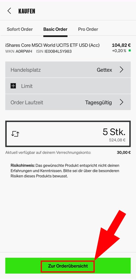 In der Basic Order-Maske könnt ihr eine klassische Marktorder platzieren, indem ihr das Limit-Fenster einfach freilasst. Dann wird eure Order (während der Handelszeiten) zum nächsten verfügbaren Preis ausgeführt. Alternativ könnt ihr eine Limit-Order platzieren, indem ihr ein Limit unterhalb des aktuellen Kurses angeben, um das gewählte Wertpapier günstiger als zum aktuellen Preis zu kaufen.