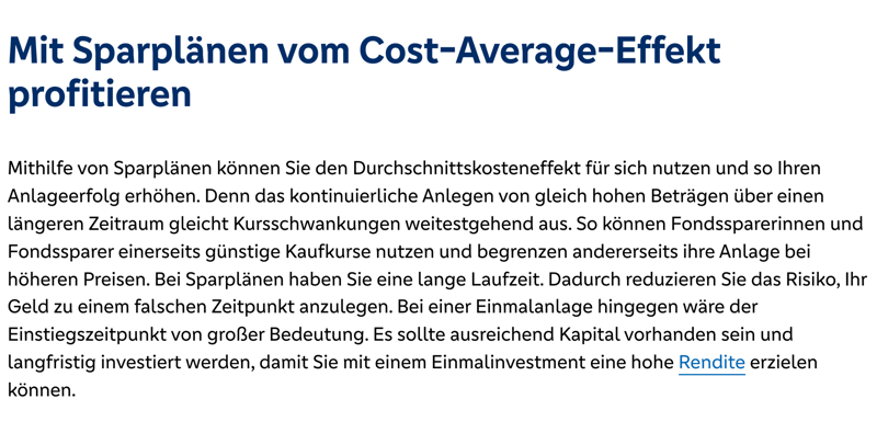 Wichtig ist, klar zu unterscheiden: Der Sparplan ist eine sinnvolle Anlagestrategie. Der Cost-Average-Effekt hingegen ist lediglich ein rechnerischer Begleiteffekt dieser Strategie, ohne allzu große Relevanz.