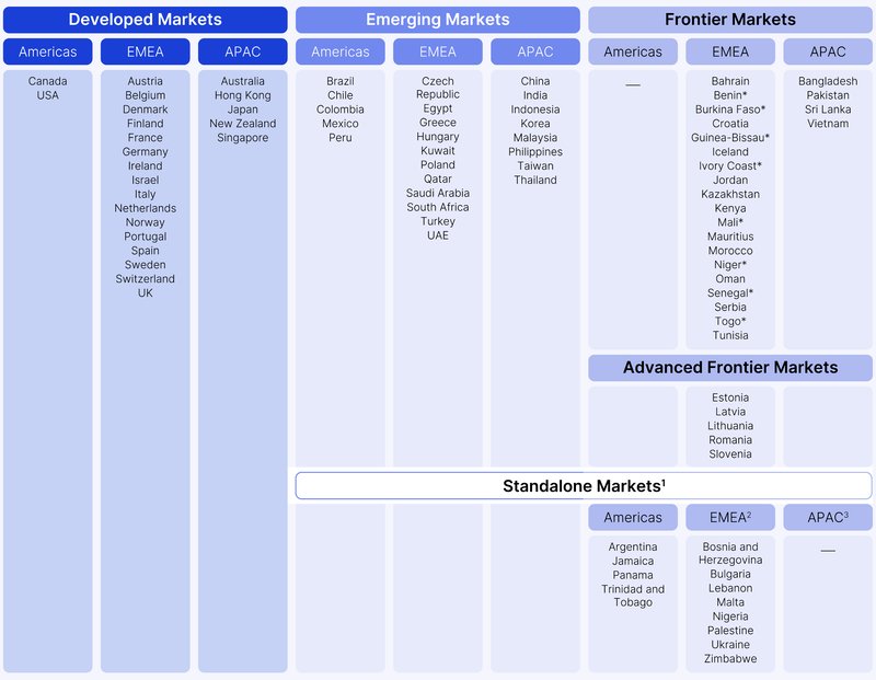 Klassifizierung der weltweiten Aktienmärkte von MSCI im Jahr 2025, EMEA steht für Europe, Middle East und Africa. APAC steht für die Region Asia-Pacific. Quelle: www.msci.com