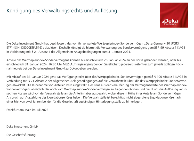 So ungefähr könnte ein Schreiben aussehen, das euch über die Schließung eines ETFs informiert (Quelle: deka-etf.de)