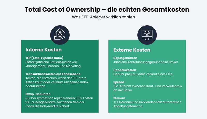 Um die tatsächlichen Gesamtkosten – Total Cost of Ownership (TCO) – zu verstehen, müssen wir zwei Ebenen unterscheiden: die internen Kosten innerhalb des Fonds (z. B. die TER) und die externen Kosten bei eurem Broker.