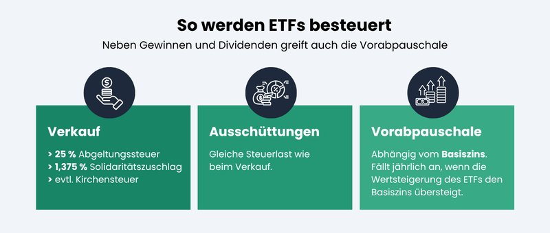 ETFs werden in Deutschland an drei Punkten besteuert – beim Verkauf, bei Ausschüttungen und jährlich über die Vorabpauschale, die auch ohne Gewinnrealisierung anfällt.