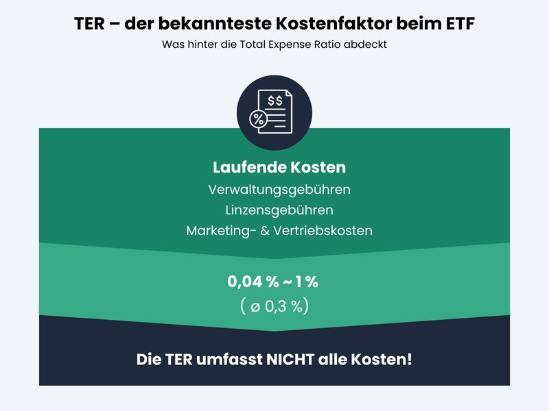 Die TER ist das offizielle „Preisschild“ eines ETFs. Sie wird jährlich erhoben und anteilig an jedem Handelstag direkt dem Fondsvolumen entnommen. Ihr bekommt also keine Rechnung, sondern der Kurs des ETFs entwickelt sich einfach minimal schlechter als der zugrunde liegende Index.