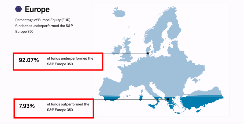 Über einen Zeitraum von 10 Jahren schafften es lediglich 7,93 % der aktiv gemanagten Fonds, den Vergleichsindex S&P Europe 350 zu schlagen. Über 92 % blieben hinter der Marktrendite zurück (Quelle: S&P Global)