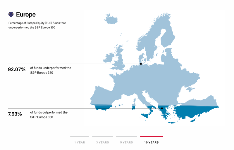 Aktiv gemanagte Fonds in Europa: Weniger als 8 % konnten ihre Benchmark in den vergangenen zehn Jahren übertreffen. (spglobal.com)