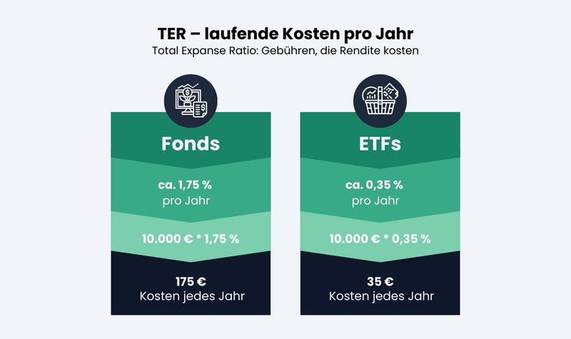 Bei den Kosten sind ETFs klar im Vorteil: Weil jene schließlich nur einen Index abbilden und keine aktiven Anlageentscheidungen erfordern, fallen Verwaltungskosten weg. Ein hilfreicher Wert ist dabei die Total Expense Ratio (TER), auch Gesamtkostenquote genannt. Sie umfasst die meisten Kosten, die für den ETF-Besitz pro Jahr anfallen.