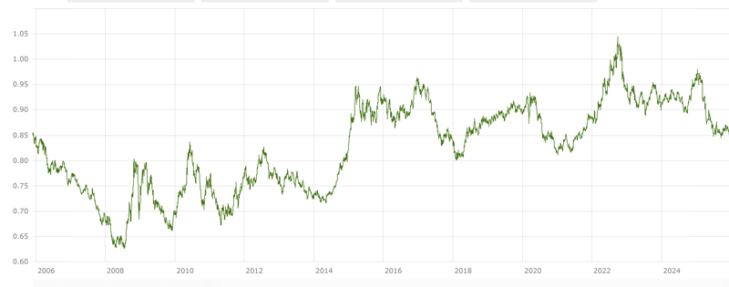 Beispiel US-Dollar: Im Dezember 2005 kostete ein US-Dollar etwa 0,85 € im Dezember 2025 wieder rund 0,85 €. In den 20 Jahren dazwischen gab es ein volatiles Auf und Ab.