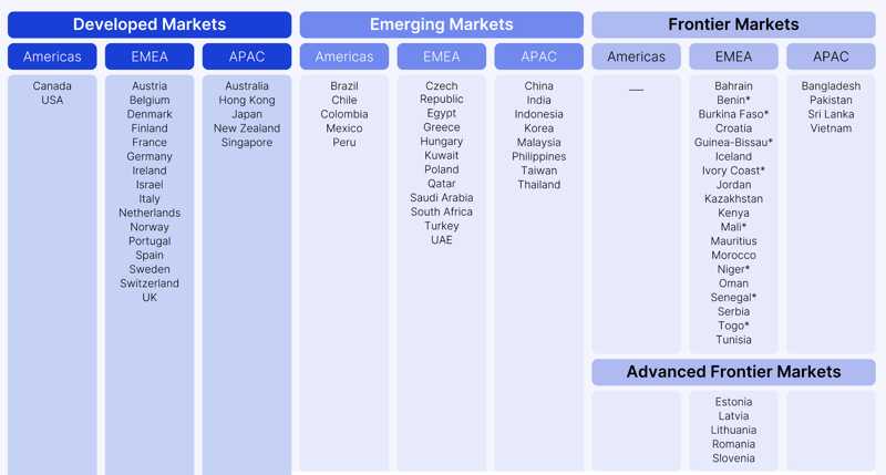 In der folgenden Tabelle von MSCI könnt ihr sehen, welche Länder in welchen Märkten verortet sind. Das ist übrigens von Indexanbieter zu Indexanbieter verschieden.
