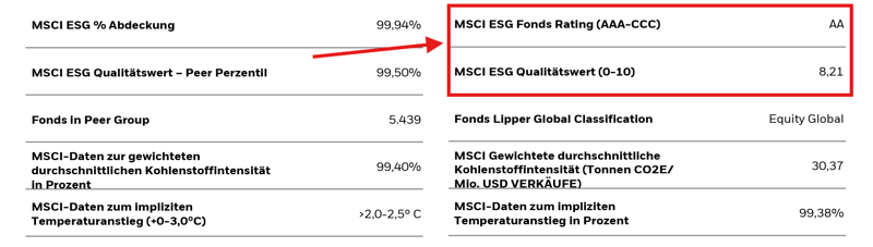 ESG steht für „Environmental, Social & Governance“, also Umwelt, Soziales & Unternehmensführung. Es handelt sich dabei um ein Bewertungssystem, das Kennzahlen zum nachhaltigen und sozial verantwortungsvollen Verhalten von Unternehmen liefert. Die MSCI ESG-Ratings und Qualitätswerte eines ETFs könnt ihr in dessen Factsheet prüfen: