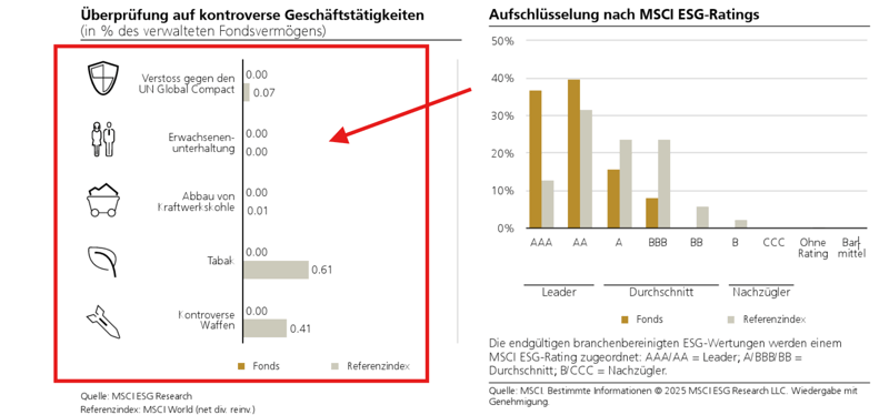 SRI-ETFs folgen den striktesten Ausschlussregeln nachhaltiger MSCI-Indizes: Unternehmen mit umstrittenen Geschäftsfeldern (u. a. kontroverse Waffen, Kraftwerkskohle und Erwachsenenunterhaltung) sowie Firmen mit Verstößen gegen den UN Global Compact werden nicht berücksichtigt.