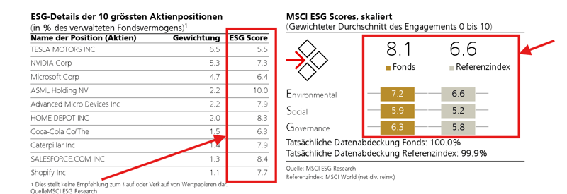 Von den zehn größten Positionen im ETF erreicht nur ein Unternehmen die Höchstnote von 10,0. Andere Firmen liegen mit ESG-Bewertungen zwischen 5 und 7 deutlich darunter. Insgesamt schneidet der ETF zwar besser ab als der MSCI World – aber ganz so „grün“, wie manche vielleicht erwarten, ist er nicht.