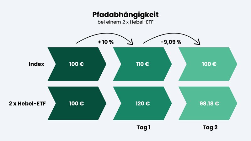 Beim Hebel-Investment steigt der ETF am 1. Tag um 20 % – von 100€ auf 120 €. Am 2. Tag fällt der Kurs um 18,18 % (2 x 9,09 %) von der neuen Basis (120 €). Während der Index in diesem Beispiel nur seitwärts verläuft, verzeichnet der 2x-Hebel Verluste und fällt auf 98,18 €.