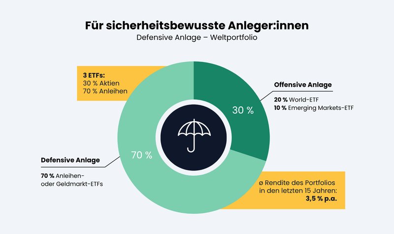 Ein defensives Portfolio mit 30 % Aktien und 70 % Anleihen, für alle, die Stabilität und Sicherheit schätzen