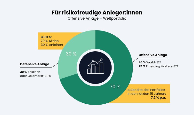 Ein offensives Portfolio mit 70 % Aktien bringt mehr Renditechancen, aber auch spürbarere Schwankungen.