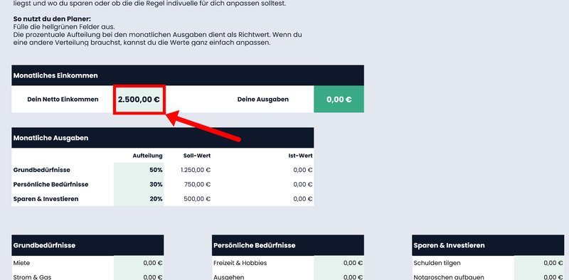 Jetzt rechnet ihr aus, wie euer Geld im Idealfall verteilt werden kann. Hier ist ein Beispiel für ein Nettogehalt von 2.500 €: