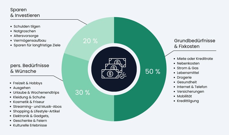 Fixkosten | 50 % | 1.250 € | Miete, Strom, Lebensmittel, Versicherungen |