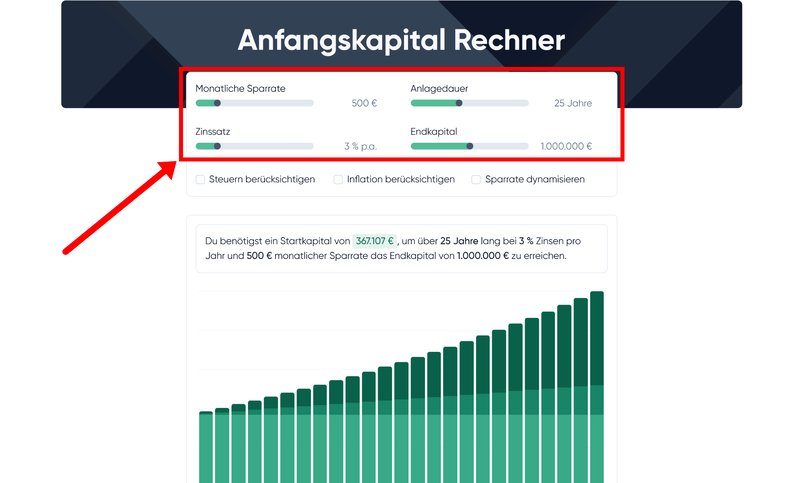 Damit das benötigte Anfangskapital berechnet werden kann, müsst ihr zunächst die Eckdaten der Anlage eingeben. Ihr könnt die Regler verschieben oder direkt auf die Zahl klicken, um sie zu bearbeiten.