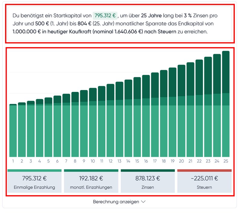 Zunächst wird in einem Satz erklärt, wie viel Startkapital ihr aktuell benötigt – und welche Rolle Steuern, Inflation oder eine dynamische Sparrate dabei spielen. So erkennt ihr direkt, ob eure Planung realistisch ist oder ob ihr an einer Stellschraube drehen müsst.