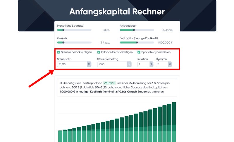 Hier könnt ihr Steuern, Inflation und eine dynamische Sparrate einbeziehen.