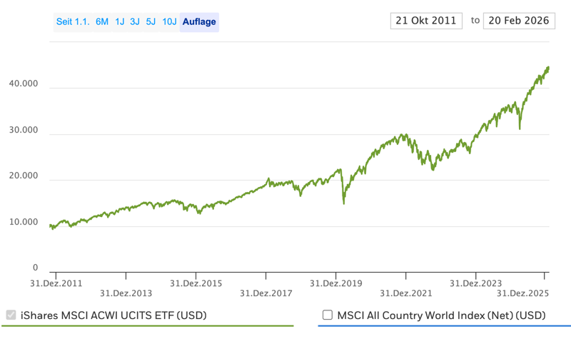 Der 15-Jahres-Kursverlauf des MSCI ACWI-ETFs von iShares.