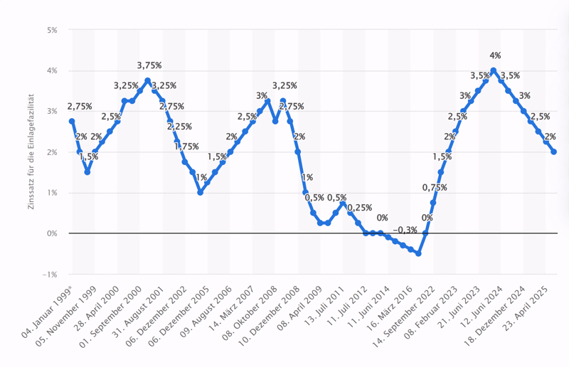 Wenn Expert:innen vom „Zinsumfeld“ sprechen, meinen sie meist die Geldpolitik der Europäischen Zentralbank (EZB). Sie ist der Taktgeber für alle Banken in der Eurozone. Der wichtigste Hebel ist der Einlagezins. Das ist der Zinssatz, den Banken erhalten, wenn sie überschüssiges Geld bei der EZB parken.